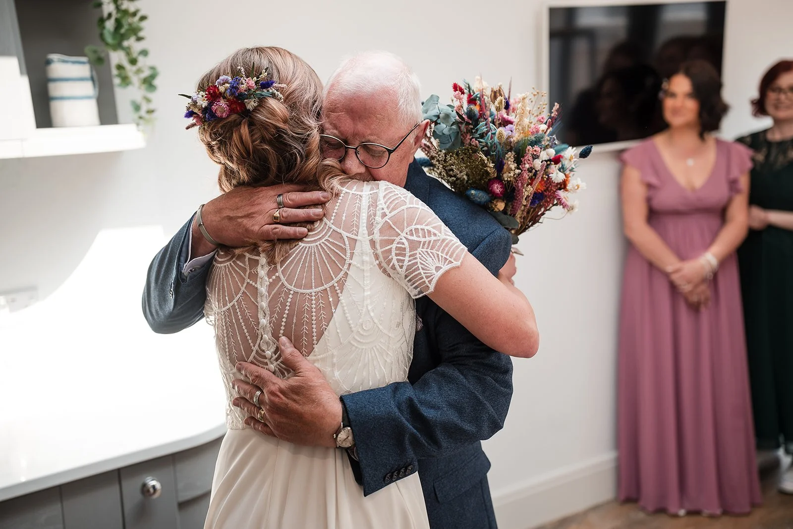 It was an early start for the bridal party with Hair by Lynsay and makeup by Ellie at Lavish Bridal well underway before we arrived. On arrival it was brilliant to chat with everyone as the excitement for the day ahead grew. As we always like to do, we took this opportunity to get some photographs of the all important details along with some candid moments of everyone enjoying the time together. This was the first time we saw Grace’s wedding dress which we found hanging beautifully in the window upstairs, the stunning dress was from Wed 2 B and we were also super excited to spot the long veil which we knew would look amazing and be perfect for photographs. We were honoured to share a couple of very special moments with Grace, firstly documenting the beautiful moment her Mum and bridesmaids helped to fasten her dress, before a very emotional first look with her Dad. We were of course on standby with the tissues!