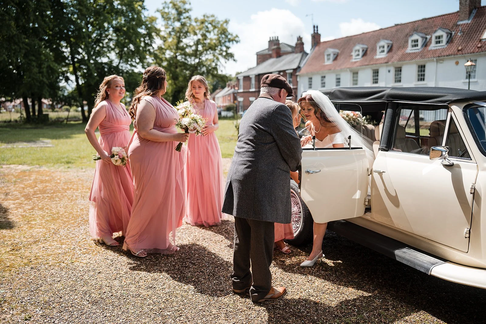Before the ceremony, Ria and her bridesmaids arrived in a beautiful historic car, sharing a few calm, joyful moments together before heading inside. After the ceremony, the feeling remained unforced and natural guests spilling out, hugs being shared, conversations flowing. We used this time to capture a handful of smaller family group photos that were important to Ria and Cavill, keeping everything relaxed and easy.