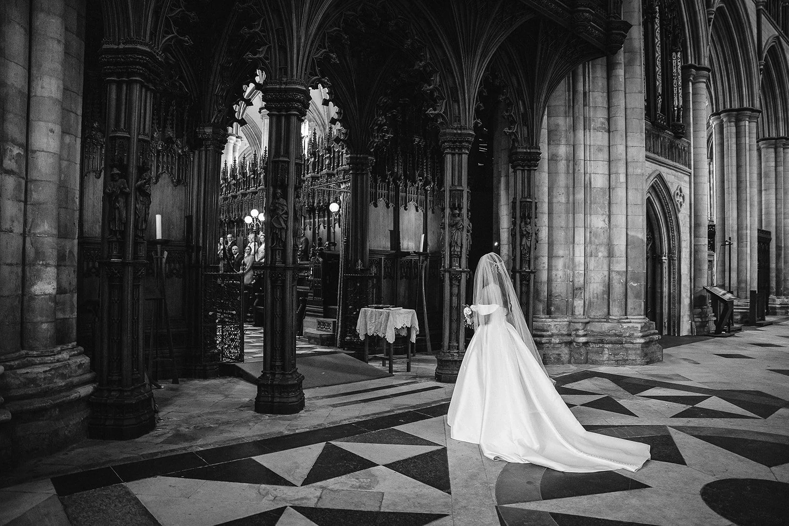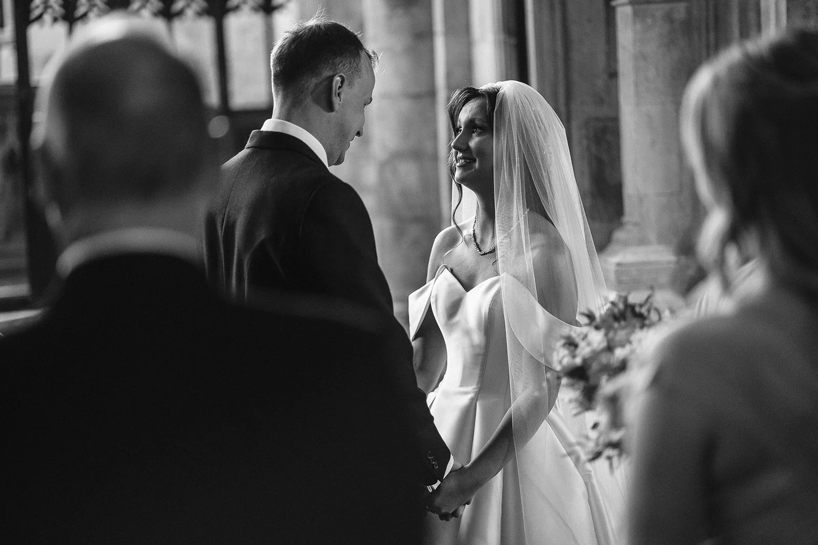 For church weddings, our approach is always calm and unobtrusive. We’re there to observe, anticipate and move discreetly, working within the guidelines of the vicar and the rhythm of the service itself. On this day, we were grateful to be allowed to photograph from the front for the entrances, Chris capturing those first moments as they happened, while Rachel documented Ria’s long walk through the Minster.