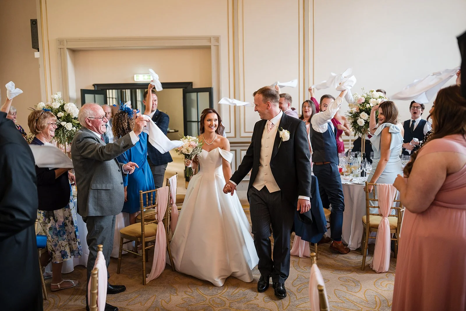 After the wedding breakfast and speeches, the couple chose to cut their cake beneath Rise Hall’s grand staircase. Guests gathered on the steps, turning it into a real moment something we hadn’t seen done quite like this before and a perfect example of making a venue work around people, not the other way around.