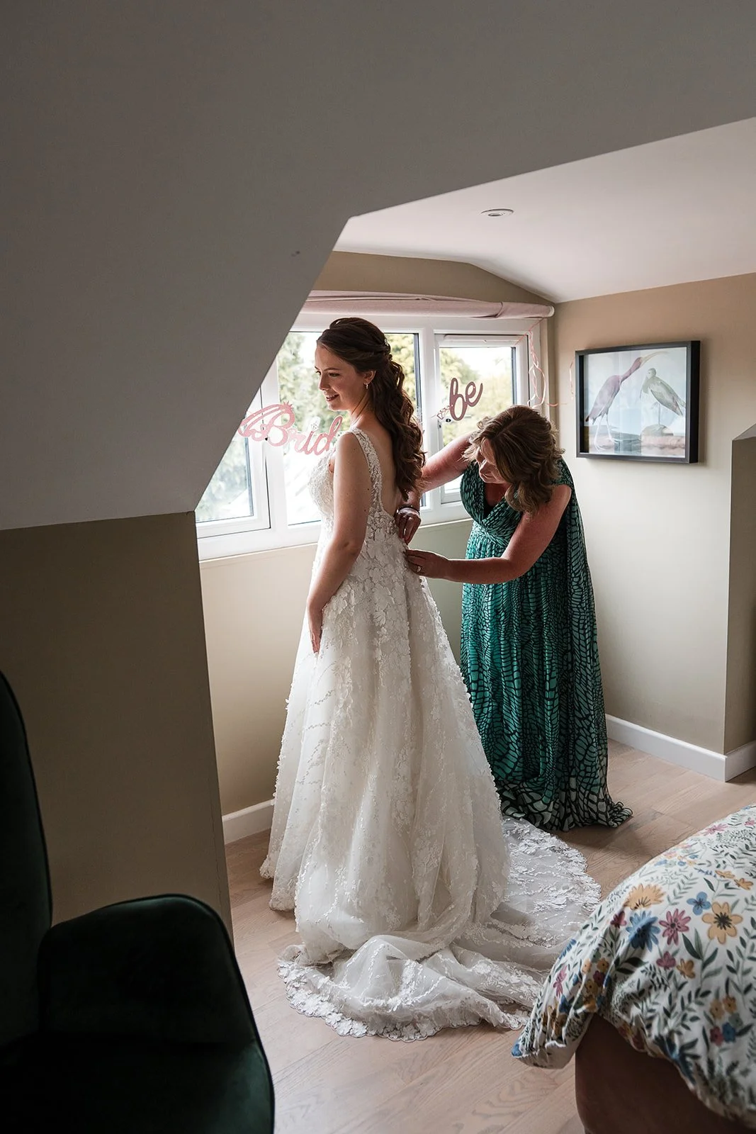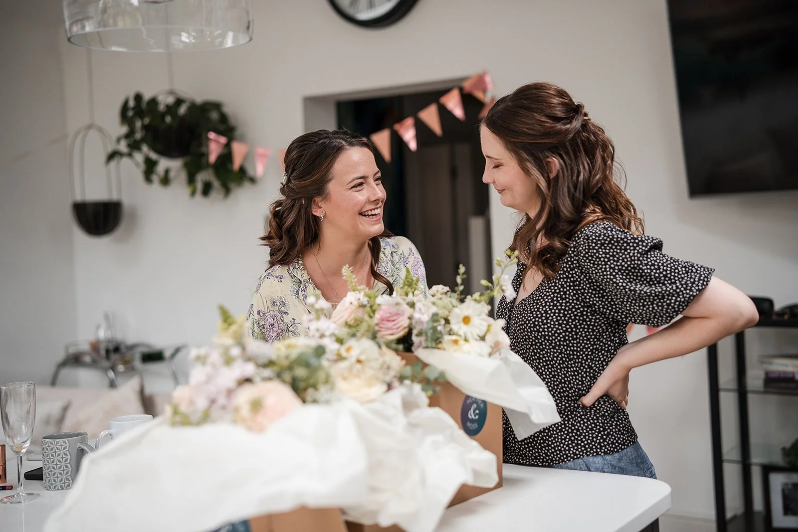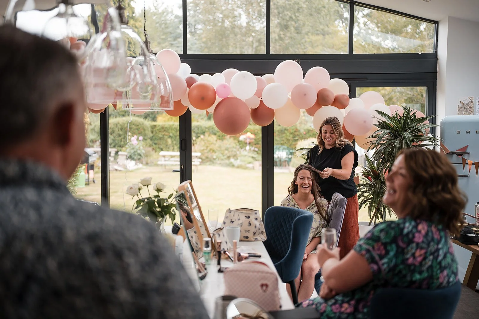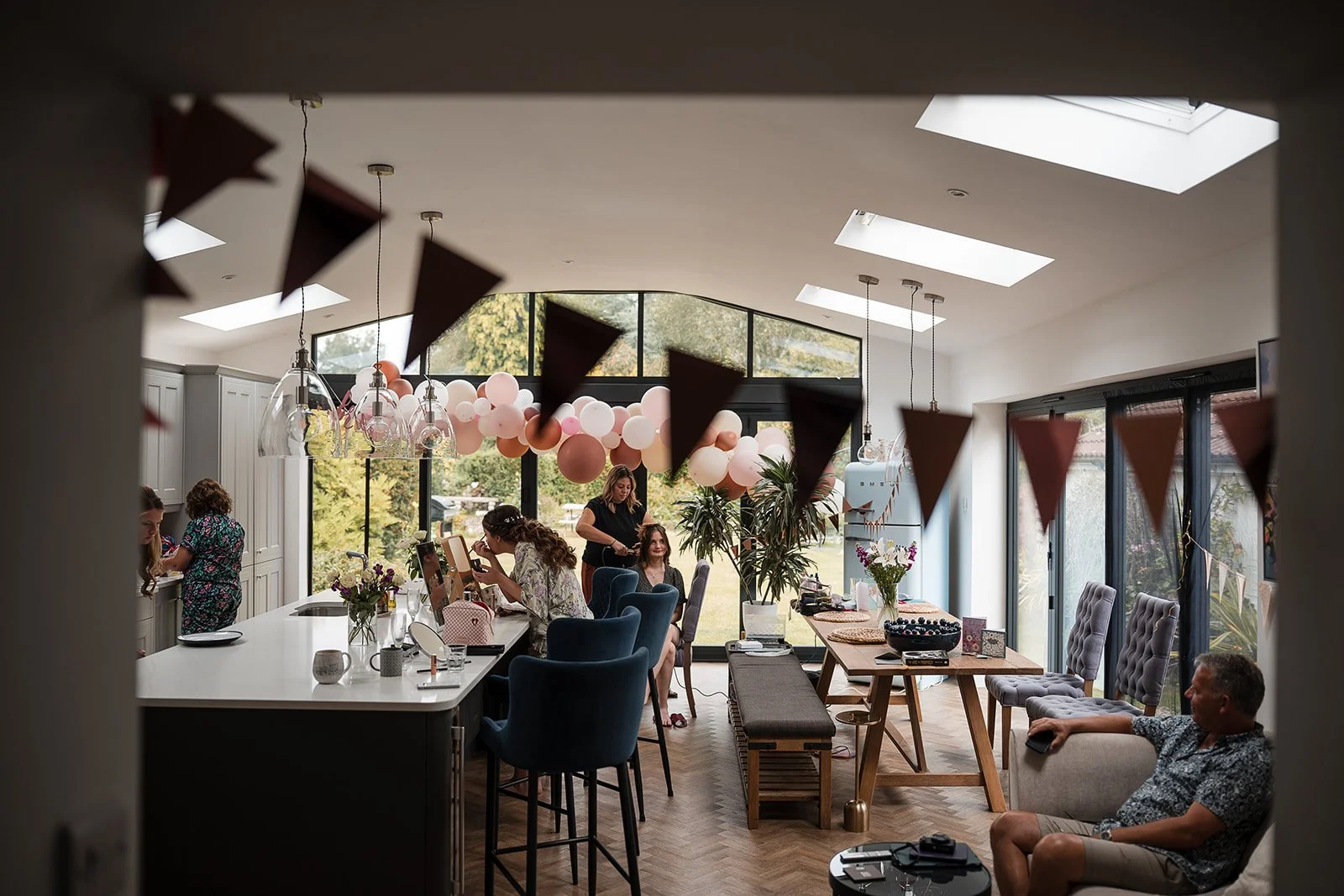 The morning began at a nearby cottage where Emily and her family were staying for the week, having travelled from further afield and turned the wedding into a proper family holiday. When we arrived, the kitchen had been decorated with bunting and balloons to mark the occasion a small but lovely gesture that set the tone straight away.